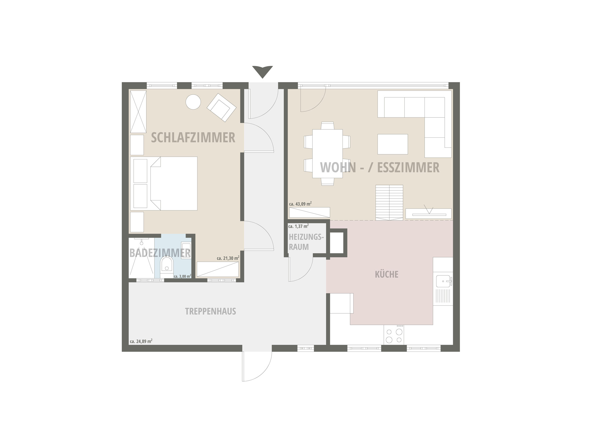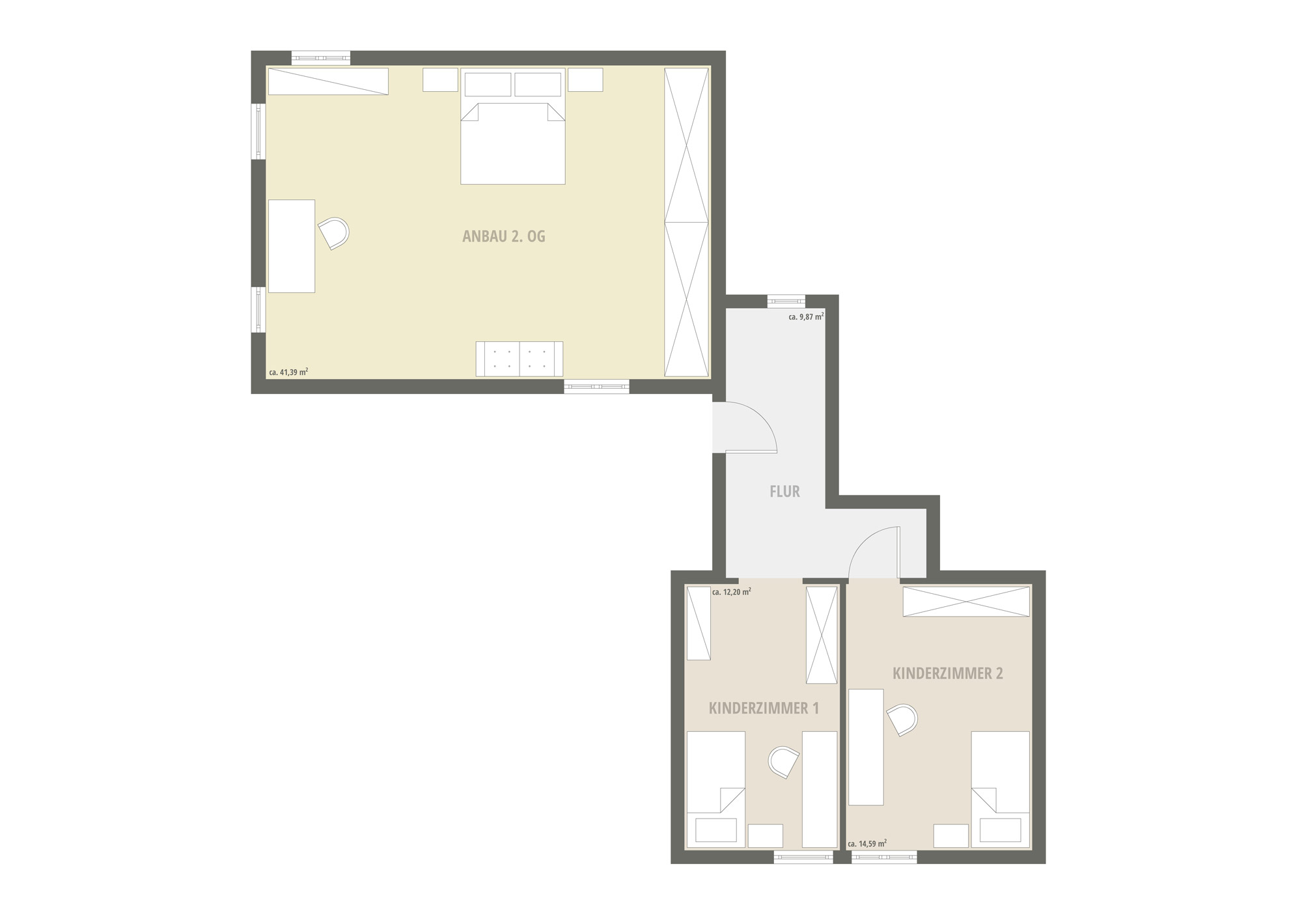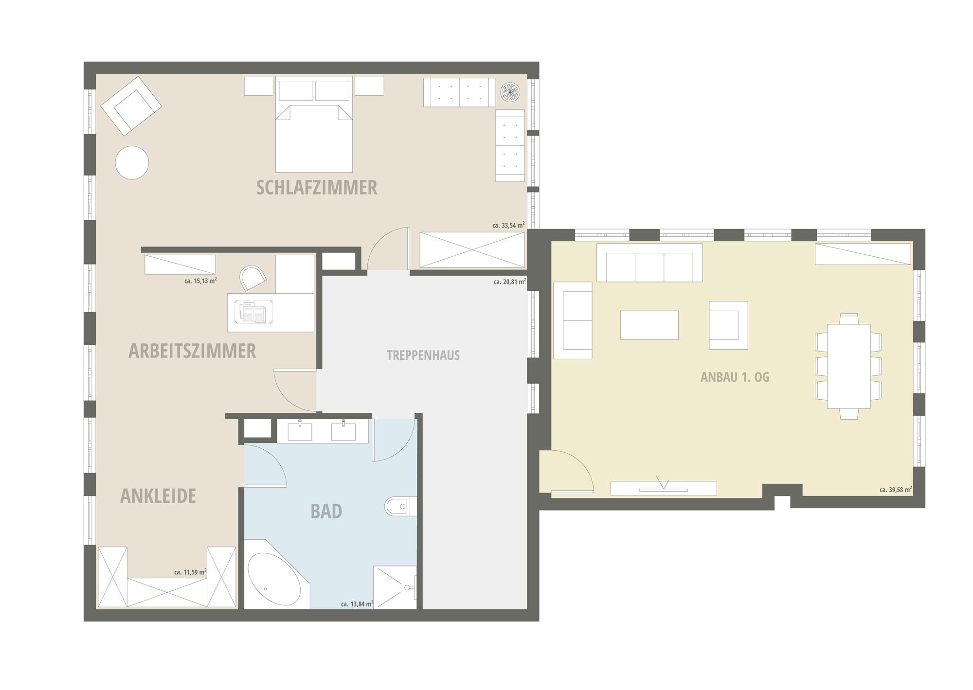 Durch diese Aufteilung entstehen zwei deutlich getrennte, aber baulich verbundene Wohneinheiten mit eigenständigen Zugängen: